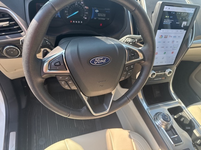 Aitkin Motor Company is pumped up to offer this outstanding-looking 2022 Ford Edge Titanium in Star White Metallic Tri-Coat, beautifully equipped with Class II Trailer Tow Package, Equipment Group 300A, 12 Speakers, 3.80 Axle Ratio, 4-Wheel Disc Brakes, ABS brakes, Air Conditioning, Alloy wheels, AM/FM radio: SiriusXM with 360L, Auto High-beam Headlights, Auto-dimming Rear-View mirror, Automatic temperature control, Brake assist, Bumpers: body-color, Compass, Delay-off headlights, Driver door bin, Driver vanity mirror, Dual front impact airbags, Dual front side impact airbags, Electronic Stability Control, Emergency communication system: SYNC 4 911 Assist, FordPass Connect, Four wheel independent suspension, Front & Rear Floor Liners w/Carpet Mats, Front anti-roll bar, Front Bucket Seats, Front Center Armrest w/Storage, Front dual zone A/C, Front fog lights, Front reading lights, Fully automatic headlights, Garage door transmitter, Heated door mirrors, Heated front seats, Heated steering wheel, Illuminated entry, Knee airbag, Leather-Trimmed Heated Sport Bucket Seats, Low tire pressure warning, Memory seat, Occupant sensing airbag, Outside temperature display, Overhead airbag, Overhead console, Panic alarm, Passenger door bin, Passenger vanity mirror, Power door mirrors, Power driver seat, Power Liftgate, Power passenger seat, Power steering, Power windows, Radio: B&O Sound System by Bang & Olufsen, Rain sensing wipers, Rear anti-roll bar, Rear reading lights, Rear seat center armrest, Rear window defroster, Rear window wiper, Remote keyless entry, Security system, SiriusXM w/360L, Speed control, Speed-Sensitive Wipers, Split folding rear seat, Spoiler, Steering wheel mounted audio controls, SYNC 4A w/Enhanced Voice Recognition, Tachometer, Telescoping steering wheel, Tilt steering wheel, Traction control, Trip computer, Turn signal indicator mirrors, Variably intermittent wipers, and Wheels: 19" Luster Nickel-Painted Aluminum!